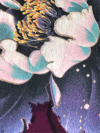 作品以牡丹花為紋樣,加以漳絨剪花的工藝和純手工縫珠繡法,精致的點綴了蠶絲厚織圍巾。搭配各種服飾都能凸顯優雅與沉穩氣質,在秋冬給人以溫暖之感。